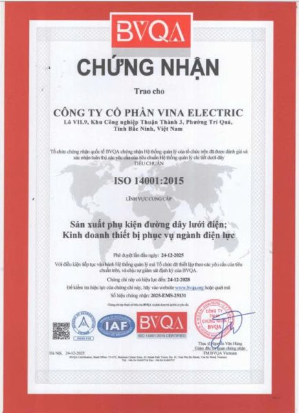 Chứng nhận ISO 14001:2015 được áp dụng cho lĩnh vực sản xuất phụ kiện đường dây lưới điện và kinh doanh thiết bị phục vụ ngành điện lực, khẳng định năng lực quản lý môi trường trong toàn bộ quá trình sản xuất – kinh doanh. Đây là tiêu chuẩn quốc tế giúp doanh nghiệp kiểm soát các tác động đến môi trường, tối ưu hóa quy trình vận hành và nâng cao hiệu quả sử dụng tài nguyên.